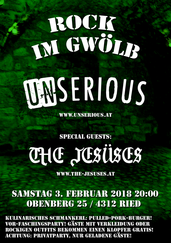 • Sa 3. Februar 2018 – Rock im Gwölb. Musik ab ca. 20:00, Privatveranstaltung. Verkleidung erwünscht!